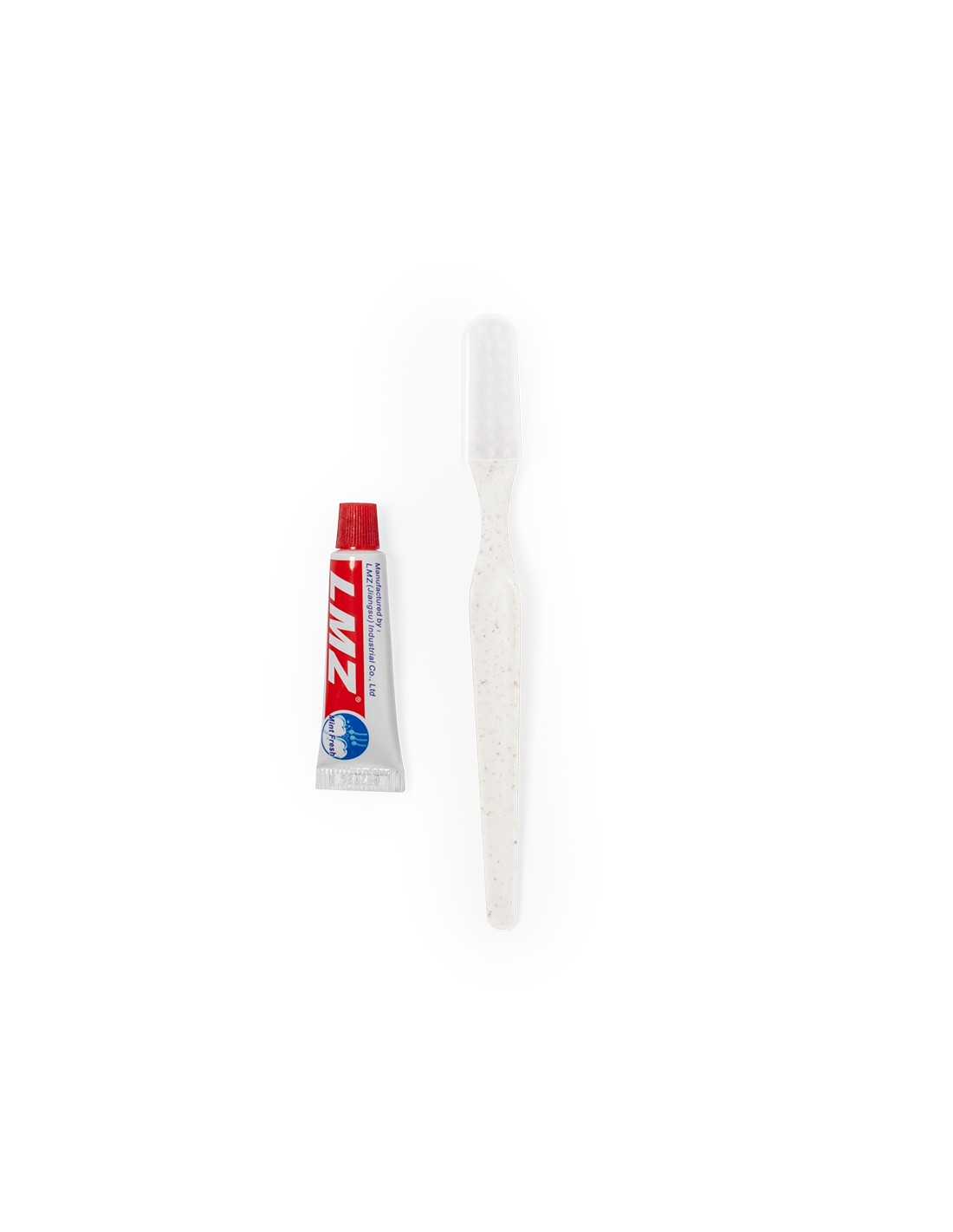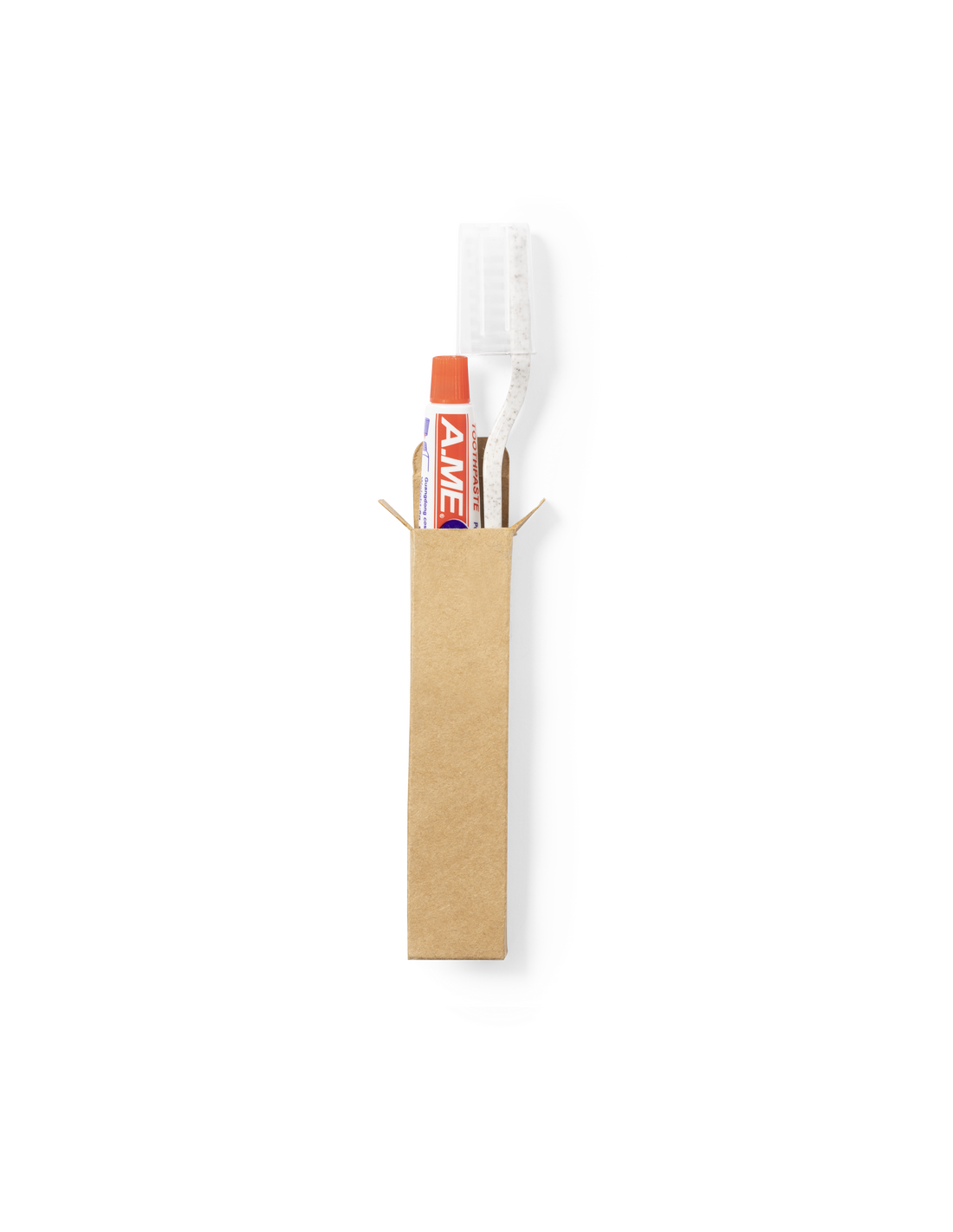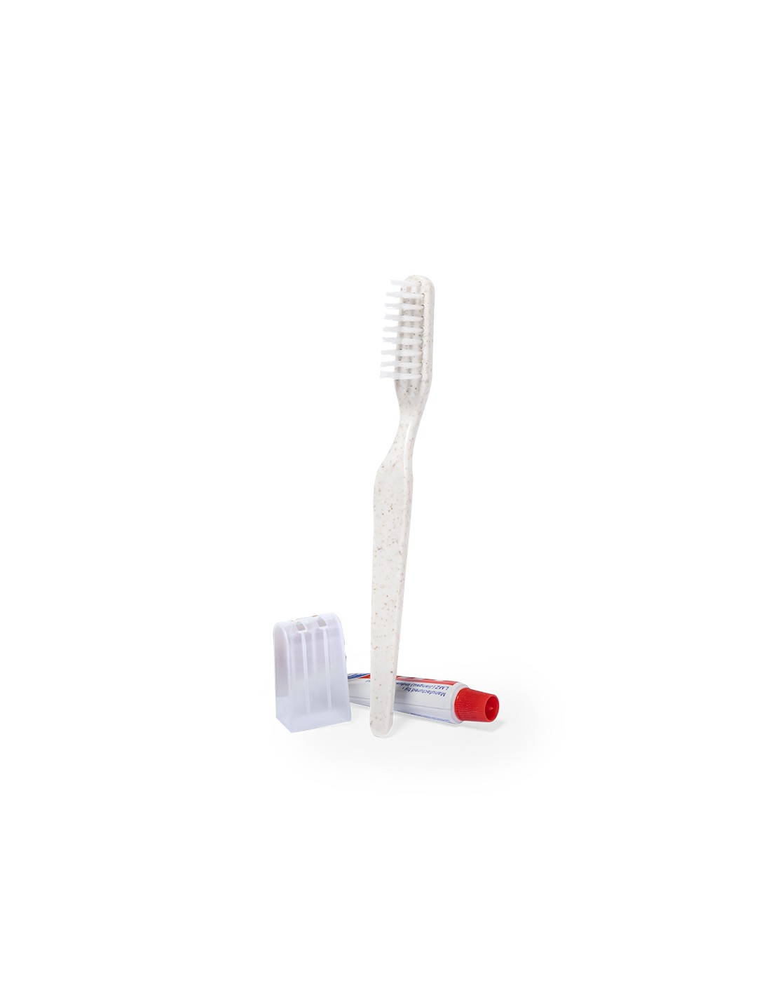 Set dental con cepillo de dientes y pasta dentífrica. Contenido:Cepillo de dientes fabricado en caña de trigo, para así fomentar la utilización de materias primas naturales y reducir las emisiones contaminantes.Pasta dentífrica en tubo de 6 gr, con tapón a rosca.Set presentado en estuche individual de cartón reciclado.