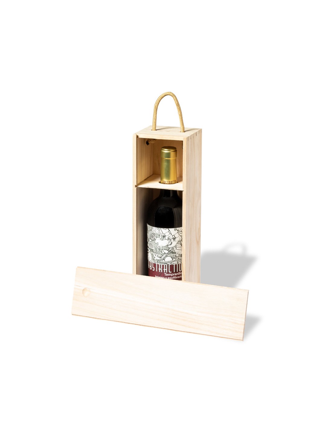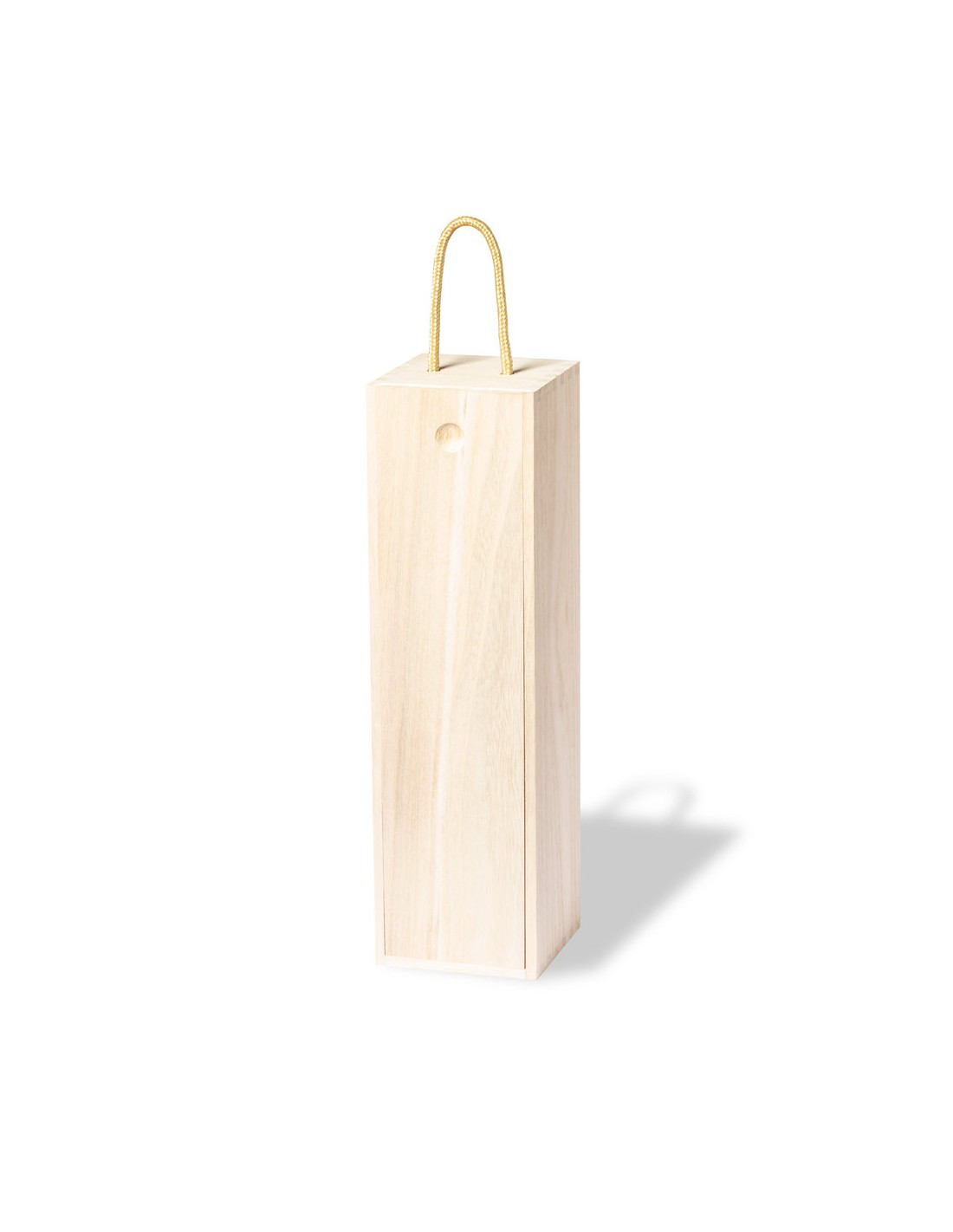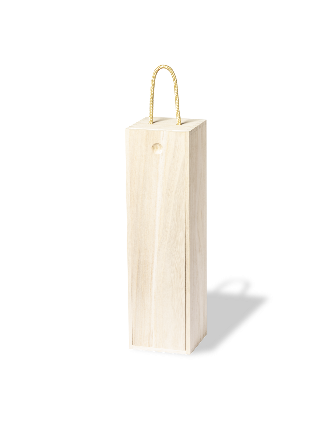 Caja de presentación premium para 1 botella, fabricada en madera natural de Paulownia, ligera y resistente. Interior con sujeción de seguridad para el cuello de la botella, con tapa deslizante y cordón de transporte.
