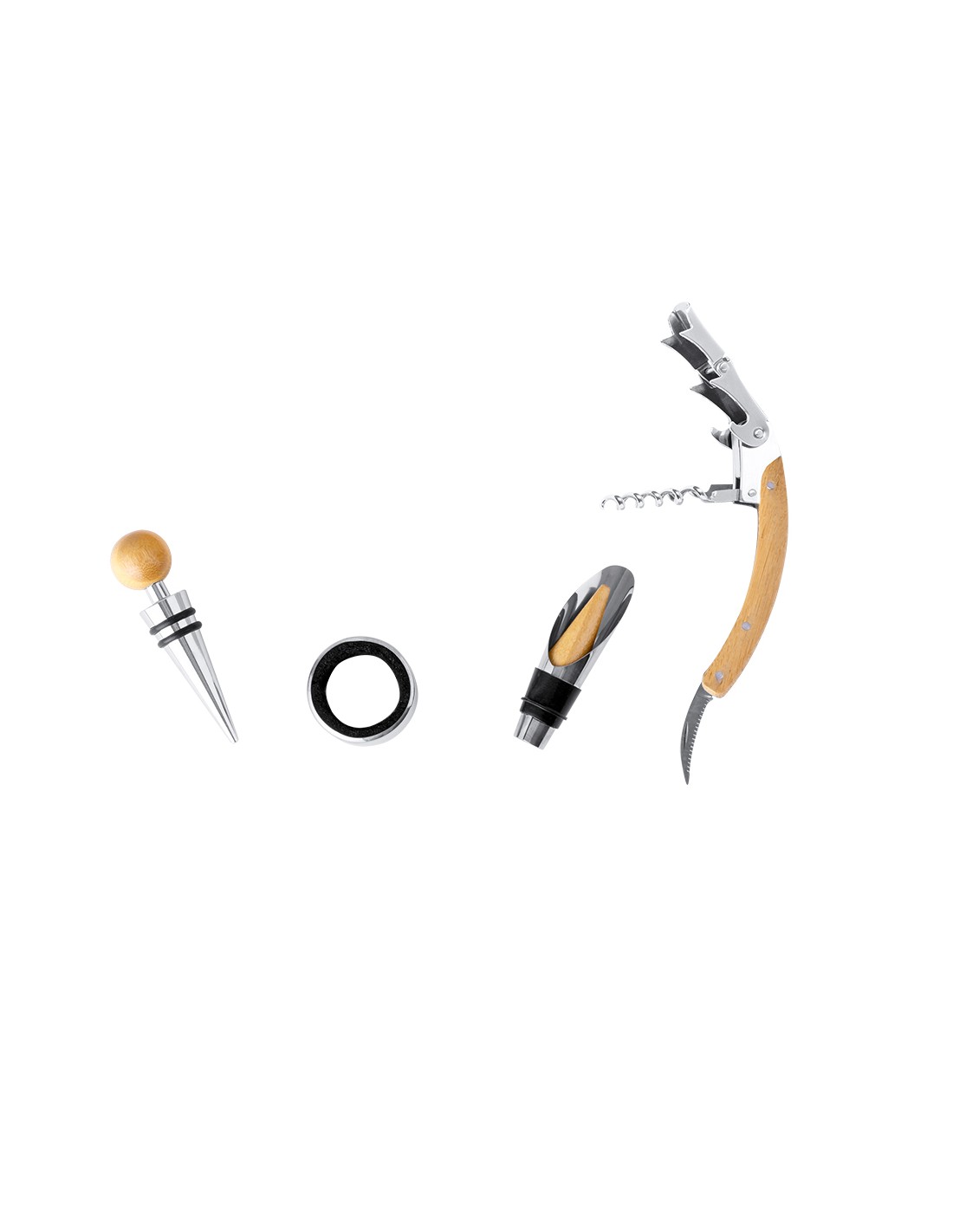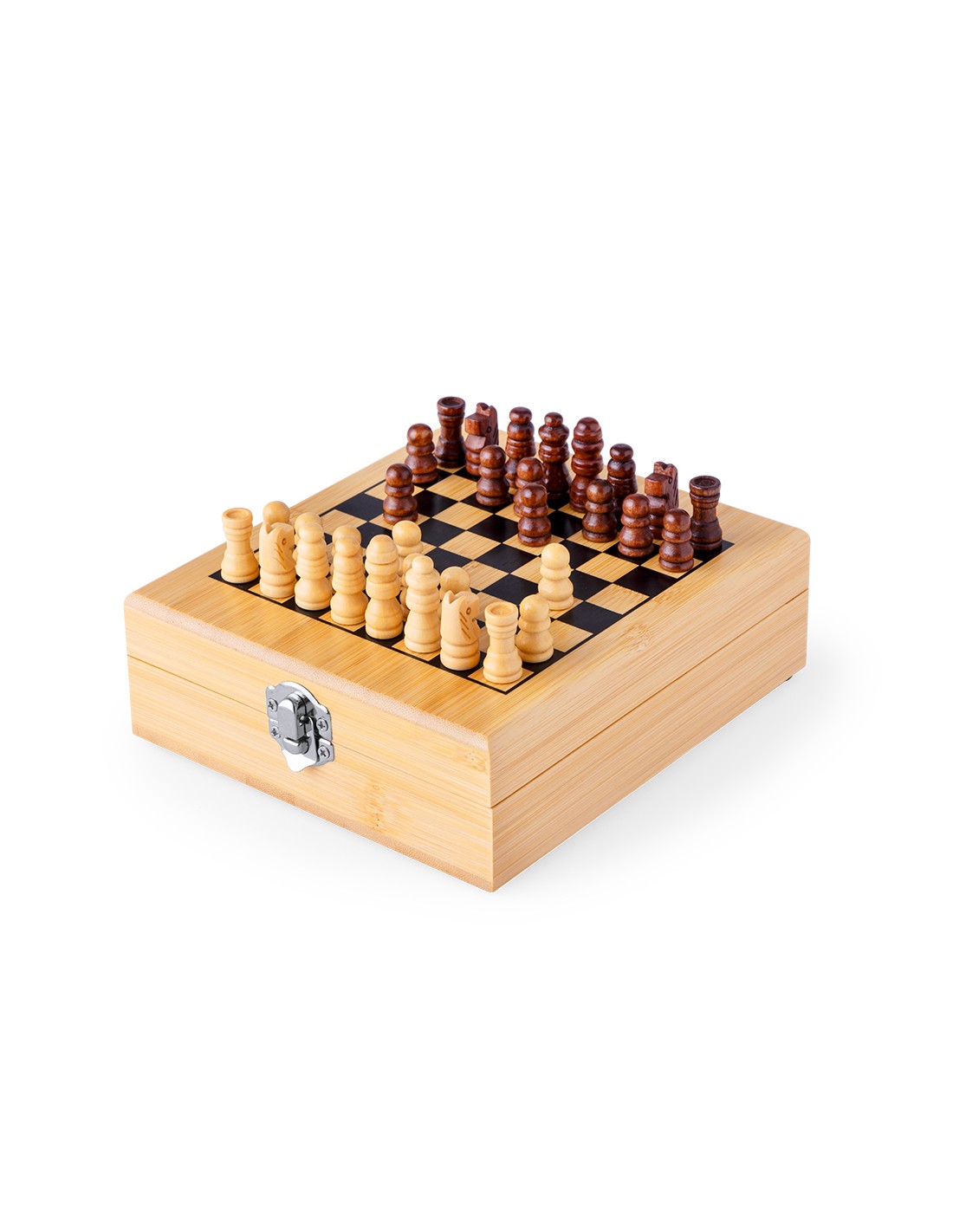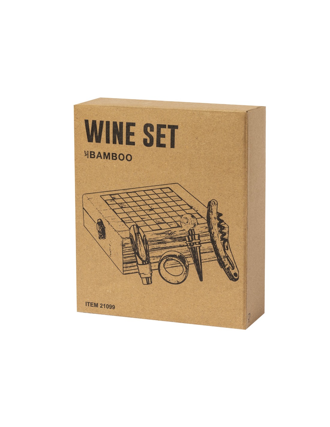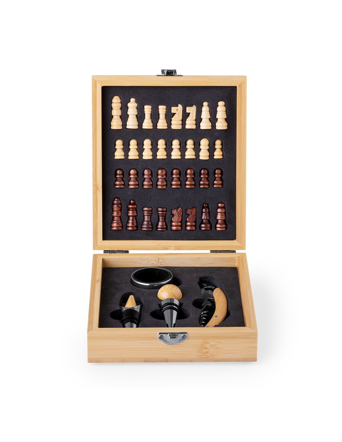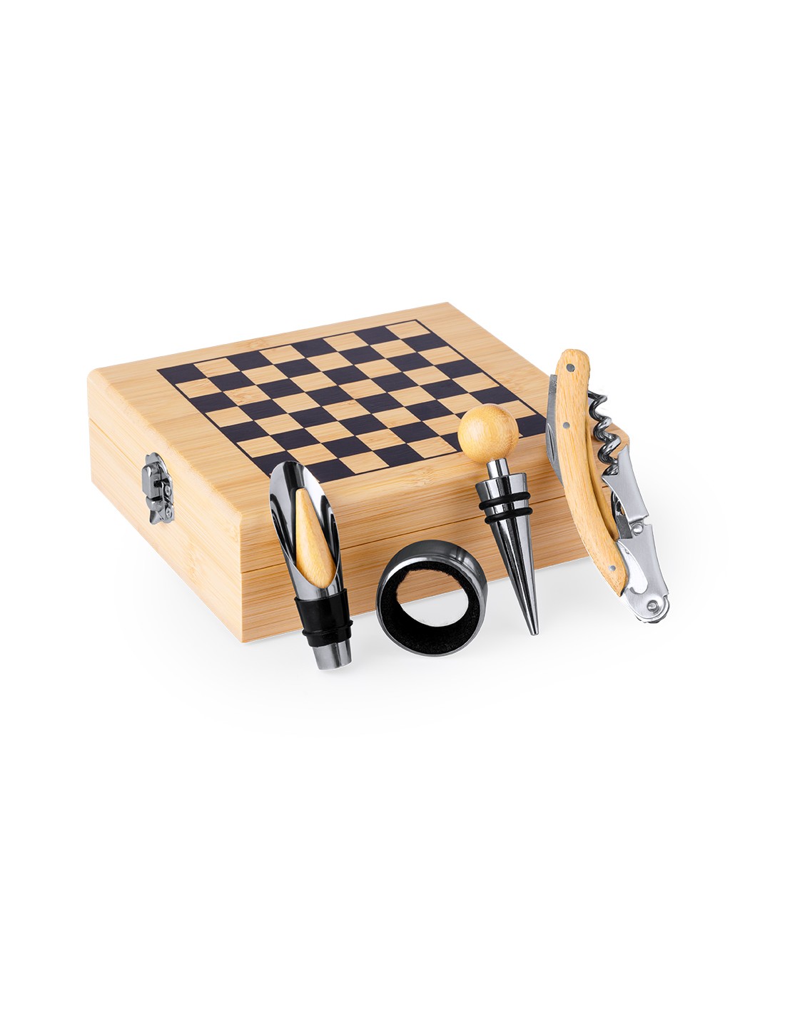 Original set de vinos ajedrez -piezas incluidas- acabado en bambú natural. Con cierre de seguridad y accesorios de acero inox y bambú. Incluye sacacorchos con cortacápsulas y abridor; tapón, decantador y recogegotas. Presentado en estuche individual con interior en suave espuma troquelada.Materiales como el bambú fomentan la utilización de materias primas naturales, reduciendo las emisiones contaminantes. Proviene de una planta de gran resistencia y versatilidad, con crecimiento y regeneración rápidos, siendo una excelente alternativa al uso de madera tradicional.