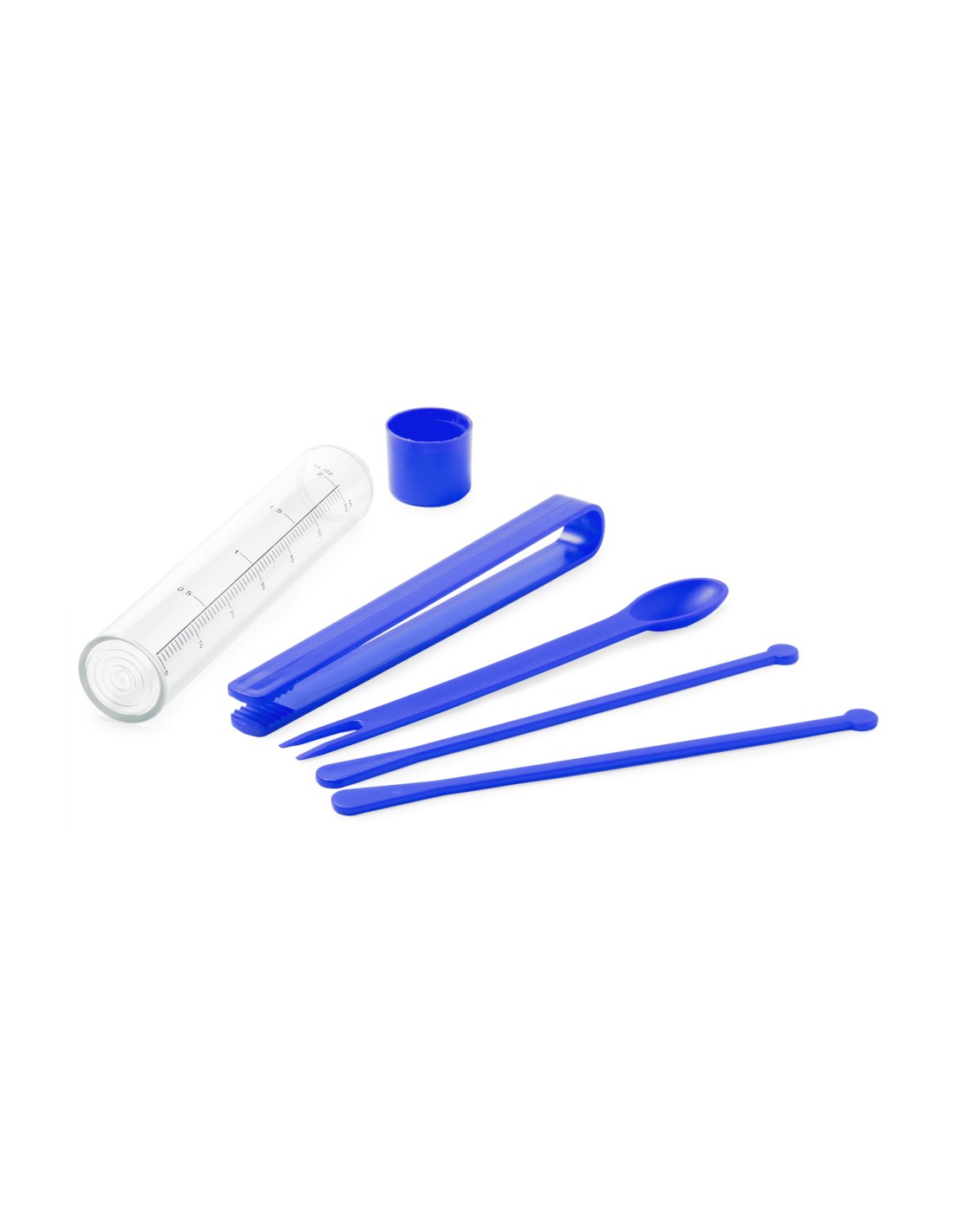 Set para cocktails de 5 accesorios en variada gama de vivos colores. Incluye envase medidor de 60ml de capacidad, cuchara trinchador, pinzas y dos agitadores.
